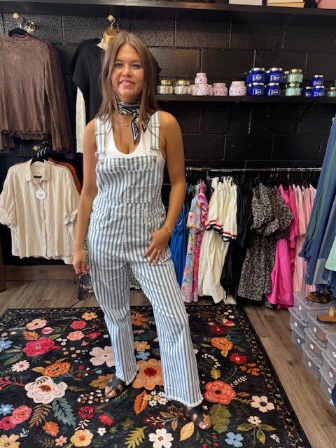 Such a flattering fit and all-day comfort! Features a front bib pocket, adjustable straps, back pockets, belt loops and a raw hem. Cut the hem to your preferred length or roll them up for a cropped look. Has some stretch.