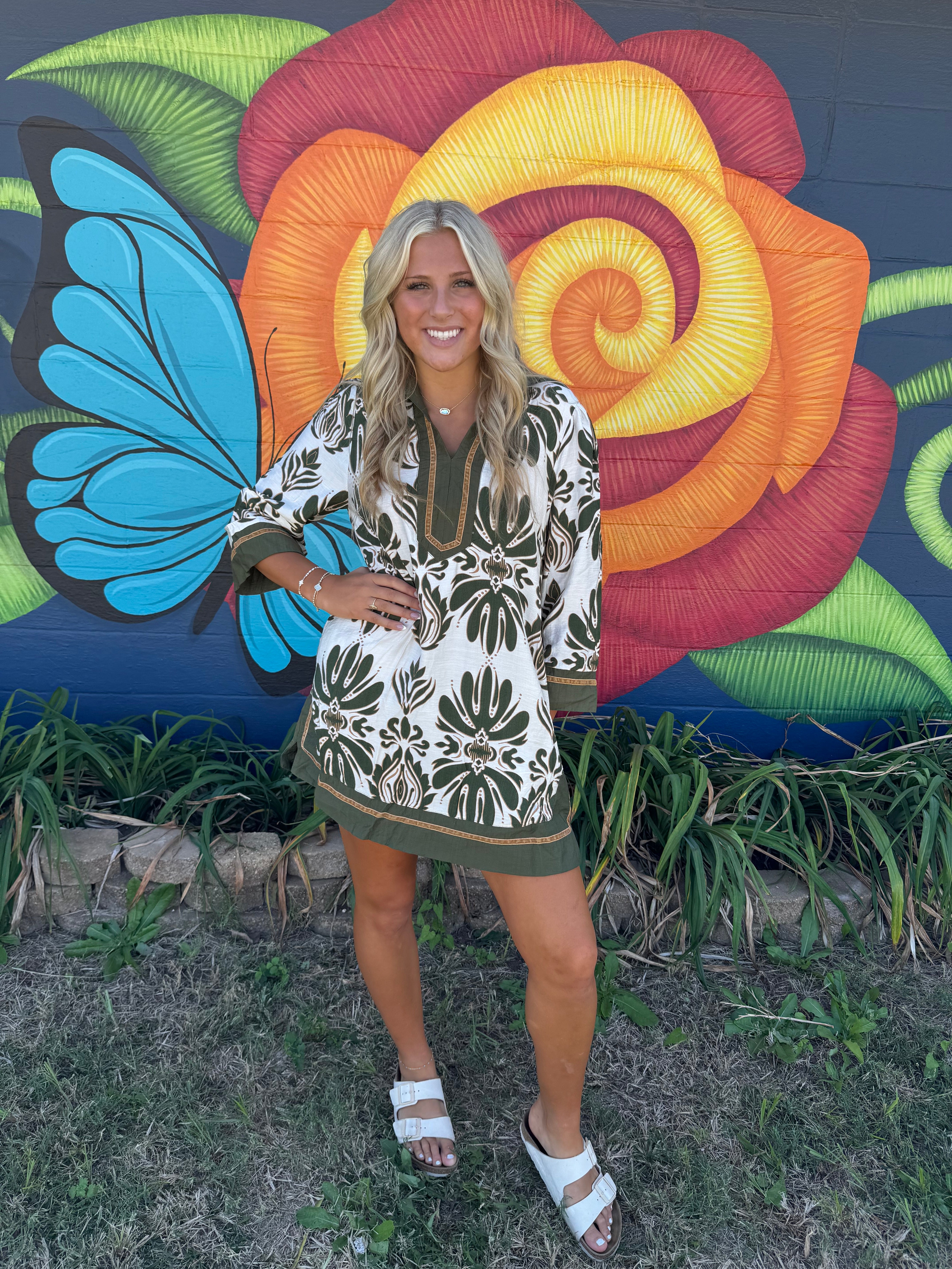This Baroque Floral Tunic Top features a deep V-notch adorned with bordered detailing for a refined look. Its 3/4 length sleeves are highlighted by contrasting trim, complemented by velvet accents that enhance its luxurious feel. Designed with side slits and a relaxed, flowy fit, this top offers both comfort and elegance. Note that it is unlined, ensuring a lightweight and breathable wear throughout the day.