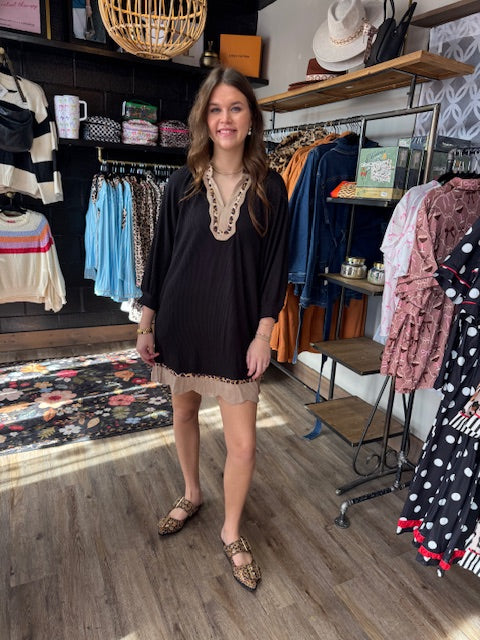 Sleek meets wild with this ribbed black dress featuring bold leopard piping that adds just the right amount of sass. The fitted ribbed fabric hugs your curves in all the right ways, while those eye-catching leopard accents bring an unexpected edge to your everyday look. Perfect for anyone who loves a little animal print drama without going full jungle mode. Dress it up for a night out or keep it casual—this piece does both with serious style.