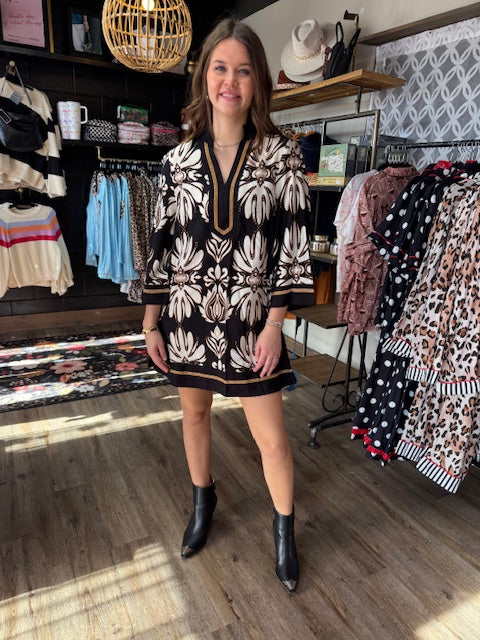 Elevate your wardrobe with this stunning Black Baroque Floral Tunic Top, where dramatic florals meet luxe gold trim for a look that's equal parts sophisticated and show-stopping. The relaxed tunic silhouette flatters every figure while the ornate baroque patterns add instant personality to your everyday style. Perfect for layering or wearing solo, this piece transforms basic bottoms into a complete fashion moment. Dress it up for brunch or keep it casual—either way, you'll turn heads.
