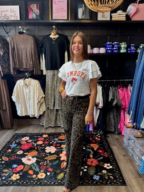 Show your school spirit with the Oklahoma State University Flutter Sleeve Crewneck Top, featuring officially licensed branding, a stylish flutter sleeve design, and a comfortable fit perfect for any occasion.