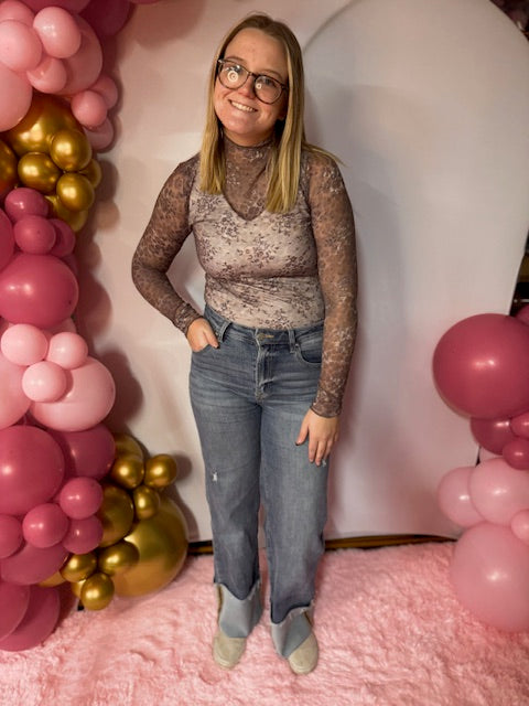 This Leopard Mesh Long Sleeve Top features a sleek fitted silhouette crafted from sheer mesh fabric, offering a lightweight and breathable wear. Designed with a sophisticated mock neckline and long sleeves, it provides a modern, elegant look without lining, perfect for layering or wearing solo to showcase its subtle transparency.