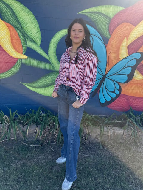 This red pinstripe shirt is your new go-to for effortless style! The classic stripe pattern keeps things timeless and put-together, while the patched chest pocket brings a laid-back vibe that's totally charming. Side slits at the hem give you the freedom to move and groove all day long, and the relaxed fit means you can wear it comfortably from morning meetings to evening hangouts. Whether you're dressing it up or keeping it casual, this shirt delivers both polish and personality in one versatile piece.
